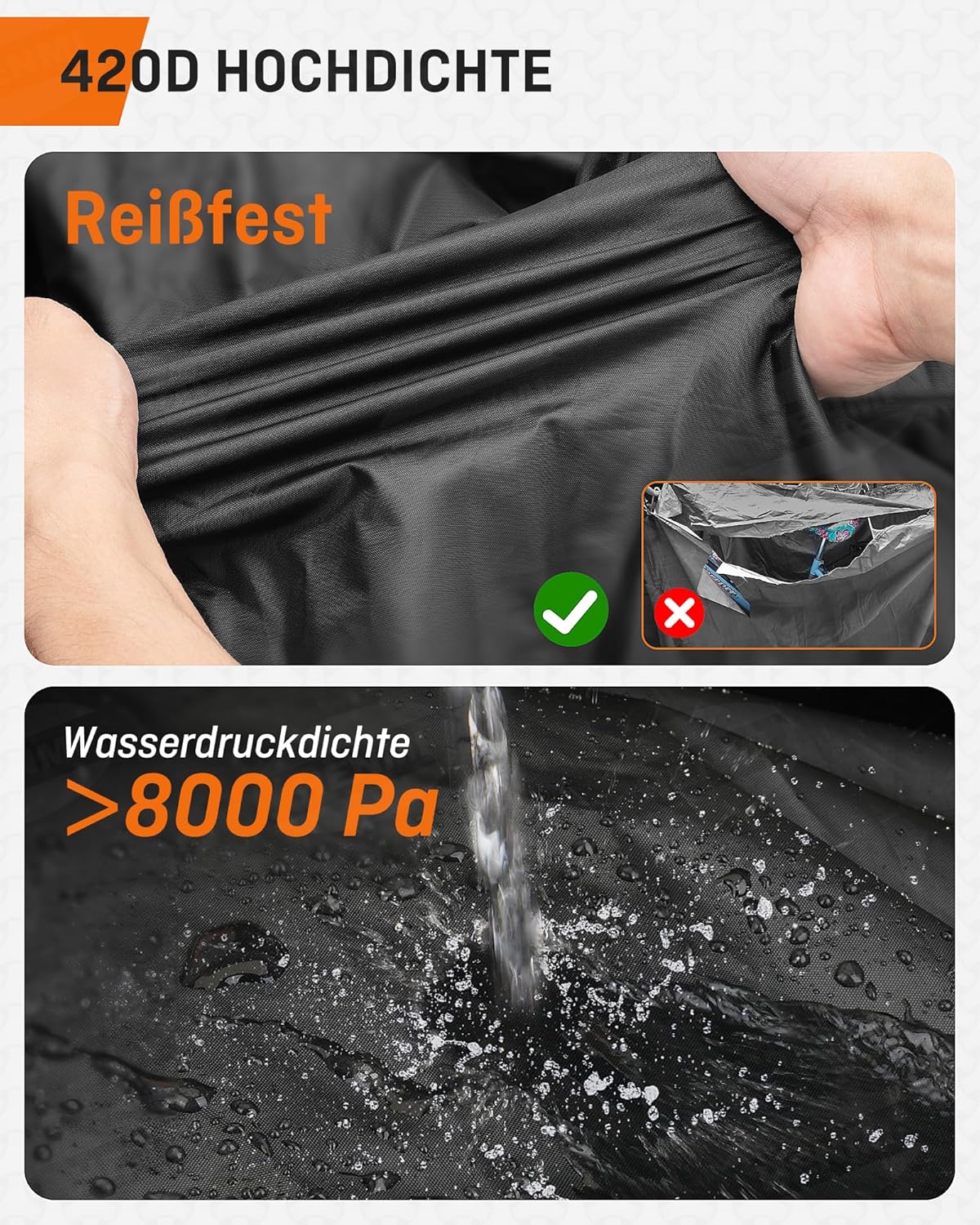 - ULTIMATIVE WASSERDICHTIGKEIT: Das präzise Doppelnahtverfahren schafft eine undurchdringliche wasserdichte Barriere für die fahrradabdeckung wasserdicht. Ob es ein plötzlicher Regenschauer oder ein langer Regentag ist, kann die hochdichte wasserdichte Beschichtung effektiv das Eindringen von Regenwasser widerstehen. Die fahrradgarage wetterfest ist atmungsaktiv, was Feuchtigkeit im Inneren der abdeckplane fahrrad verhindert und Geruch reduziert.