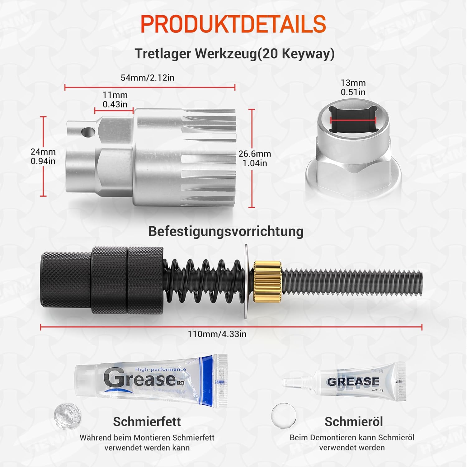 - Lieferumfang: Das Fahrrad Werkzeug Enthält (Innenlager Entferner * 1, Schmieröl * 1, Schmierfett * 1, Verriegelungseinrichtung * 1).