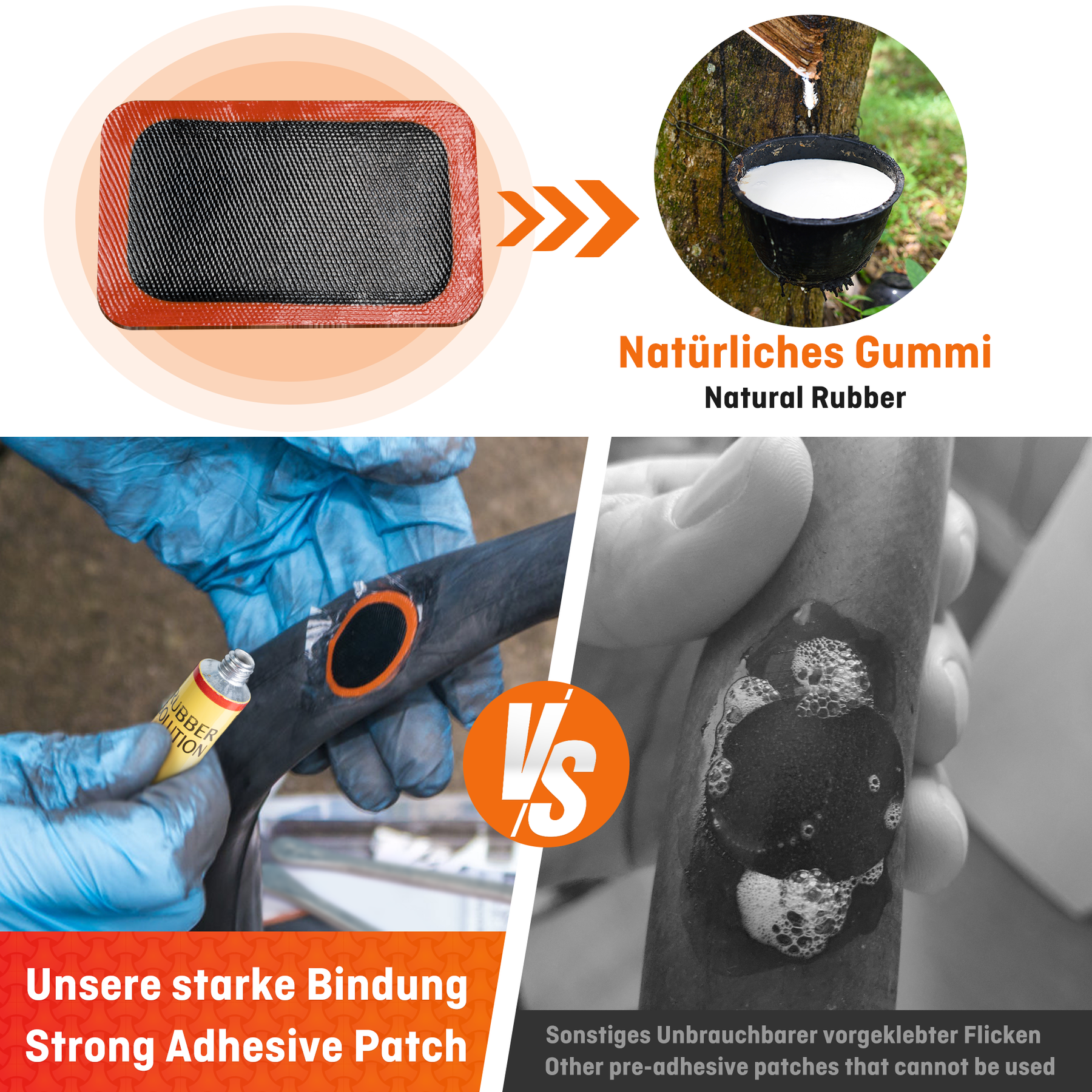 Dauerhafte Reparatur: Fahrrad flickzeug Ausführung aus Reifenreparaturkleber und Flicken hat eine starke Haftung, die einem höheren Reifendruck standhält als der vorgeklebte Flicken. Die reparierte Röhre funktioniert wie neu.